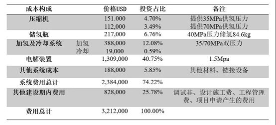 電解水制氫成本主要是電的成本,每立方氫氣生產(chǎn)需要消耗5度電左右。盡管部分站內(nèi)電解水制氫加氫站會(huì)采取氫光互補(bǔ)的戰(zhàn)略,然而依然離不開市電。國(guó)內(nèi)火電占市電的比例達(dá)到70%,意味著制出來(lái)的氫氣大部分屬于灰氫。這也意味著,制取每公斤氫氣的成本將達(dá)到60元左右。其投建成本包括建設(shè)費(fèi)用、制氫設(shè)備(電解裝置)、氫氣純化、壓縮設(shè)備(壓縮機(jī))、儲(chǔ)氫設(shè)備(儲(chǔ)氫瓶)和加氫設(shè)備(加氫及冷卻系統(tǒng))等幾大方面的成本支出,成本構(gòu)成如下: