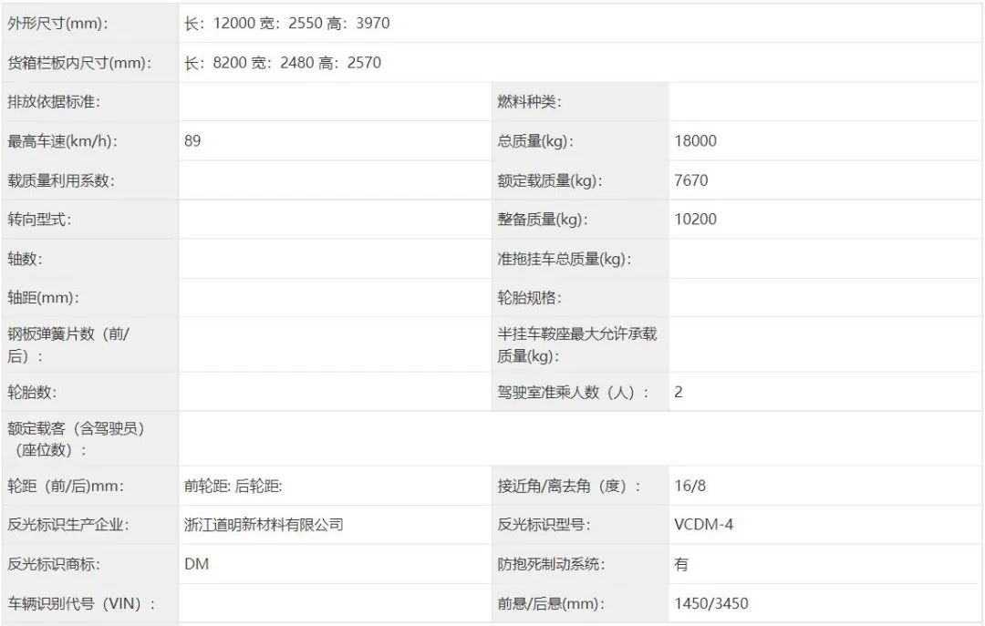 公示信息顯示,遠程新款甲醇重整制氫載貨底盤產品型號DNC1188FCEVGMPJ1,外形尺寸11800×2550×3970mm,軸距7100mm。總質量18000kg,整備質量7800kg。