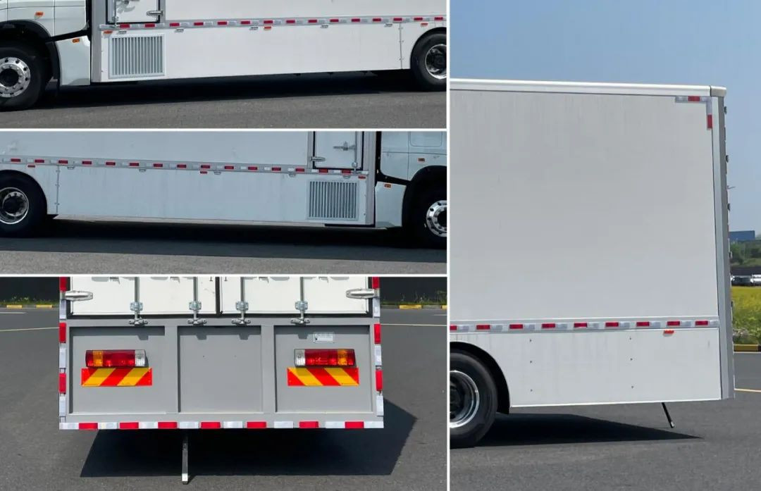 其他方面,車輛車廂頂部封閉不可開啟,側防護為裙邊結構,左右對稱。側防護所用材料為Q235A+熱塑性玻璃纖維增強蜂窩板,連接方式為螺栓連接。后防護為裙邊結構,后防護所用材料為Q235A,連接方式為焊接,后防護離地高度480mm,并可外接充電。