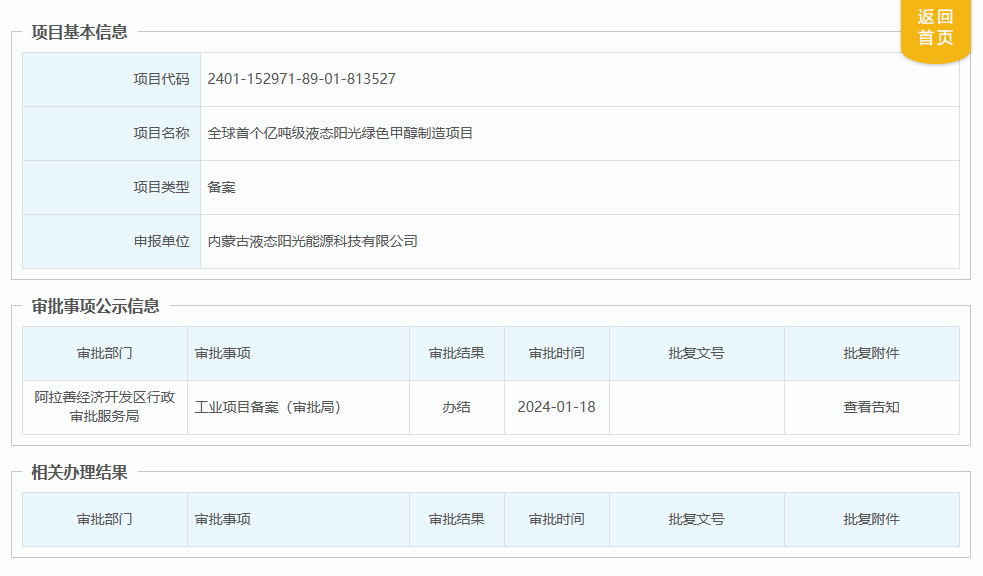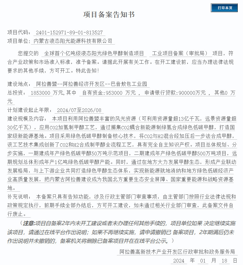 1月18日,全球首個億噸級液態陽光綠色甲醇制造項目獲批阿拉善高新技術產業開發區行政審批和政務服務局就該項目發布《項目備案告知書》。