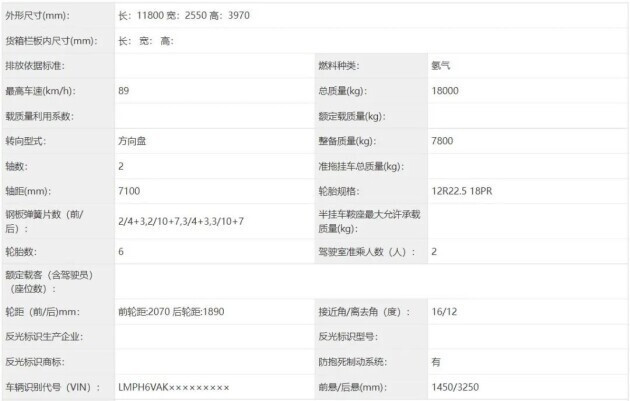 The public information shows that the remote new methanol reforming hydrogen production cargo chassis product model DNC1188FCEVGMPJ1, shape size 1180025503970mm, wheelbase 7100mm. The total mass is 18000kg and the preparation mass is 7800kg. In terms of power, the vehicle is equipped with methanol reforming hydrogen production engine and Bosch hydrogen-air proton exchange membrane fuel cell; matched with lithium manganese anate battery, equipped with Suzhou green control drive TZ310XS-LKM0824 permanent magnet synchronous motor with rated power of 112kW, peak power of 246kW and maximum speed of 89 km/h.